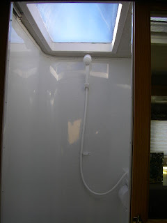 In place of a microwave, we had the cabinet above the stove made into a place to hold the Nomad 2 controller (visible) for the satellite dish. The satellite receiver sits on top of the Nomad 2 controller (not included). The black coiled cable coming from the ceiling is the Wilson Shorty Thru-Roof antenna. We connected this antenna to a Wilson wired 3-amp amplifier which, in turn, was connected to a Verizon USB modem which was inserted into a Cradlepoint 1000 router. The stuff for the TV and the stuff for the Internet are connected to their own power bar (one of which is visible in the picture) so when we were boondocking (which is most of the time), we could turn off what wasn't being used.
